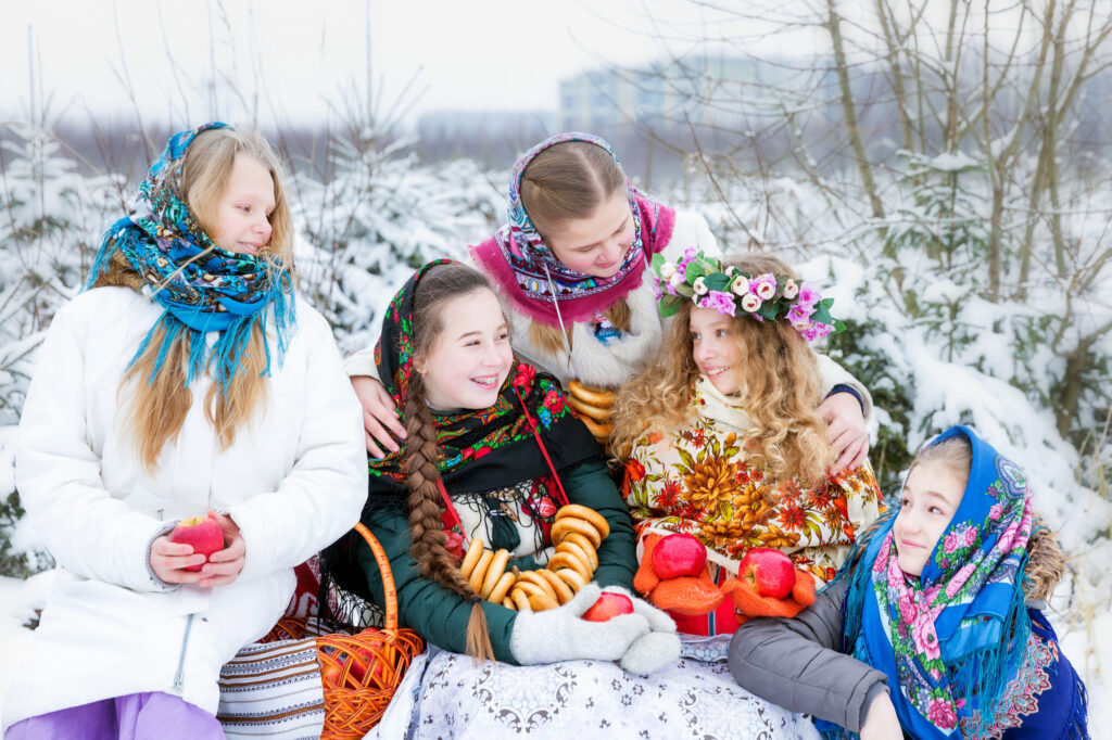 在古俄罗斯,这是欢乐和庆祝的时光。年轻人挨家挨户唱颂歌——赞美主人并祝愿他们富裕的歌曲。装扮者——戴着面具和奇装异服的人——表演小品和笑话,主人用姜饼、馅饼和糖果招待他们。在一些村庄,还举办圣诞木偶剧——以圣经故事为题材的木偶表演。