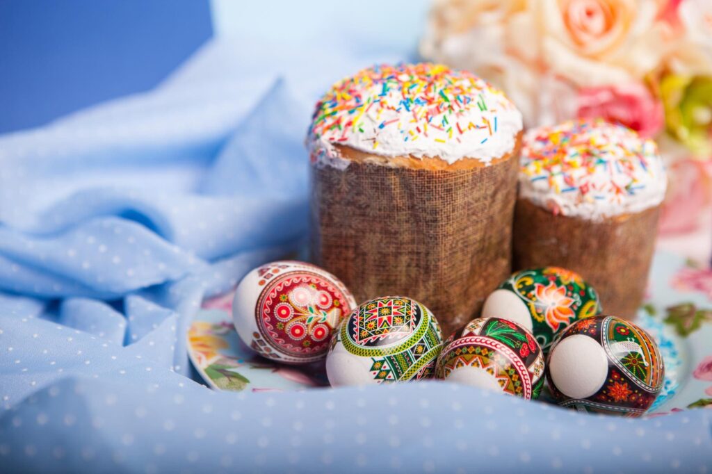 日期每年变化——根据阴历计算,在三月底到五月初之间。节日前有为期七周的大斋期。这是禁欲和精神准备的时期。最后一周——受难周——最为严格。正是在这些日子里,主妇们开始准备主要的美食:烤复活节蛋糕、制作奶渣复活节甜品、染彩蛋。染彩蛋是一个古老的仪式,可追溯到早期基督教时代。传统颜色是红色,象征生命和复活,尽管今天各种颜色的彩蛋已不足为奇。